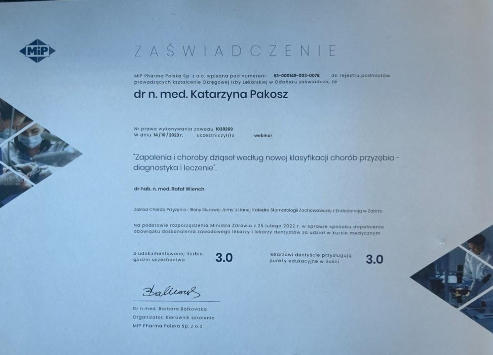 Jako specjalista periodontolog wie, jak ważną rolę w zachowaniu zdrowia jamy ustnej stanowi systematyczna, poprawna jej higiena, dlatego konsekwentnie i do wielu lat uczy dobrych nawyków swoich Pacjentów. Szczególną uwagę przywiązuje do konsultacji, a przede wszystkim do diagnostyki Pacjenta, wiedząc, że to ona stanowi klucz do skutecznego leczenia. W swojej pracy chętnie wykonuje też zabiegi protetyczne. Cieszą ją jej spektakularne efekty oraz nowe, piękne uśmiechy Pacjentów.