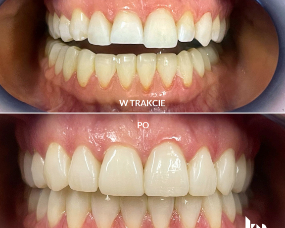 Uzyskaliśmy zdecydowaną poprawę estetyki uśmiechu - nie tylko jaśniejsze, estetyczne zęby w odcinku przednim, ale również zdecydowanie ładniejszą linię ułożenia warg. Taki rezultat udało nam się uzyskać dzięki pracy protetycznej - podniesieniu wysokości zwarcia a także licówkom, które tak zostały przygotowane, że wypchnęły delikatnie siekacze do przodu, niwelując efekt zapadniętych ust. Pacjentka jest bardzo zadowolona z efektu, my również. Oczekujemy na drugi etap, który będzie obejmował leczenie zębów w odcinku dolnym (w żuchwie).